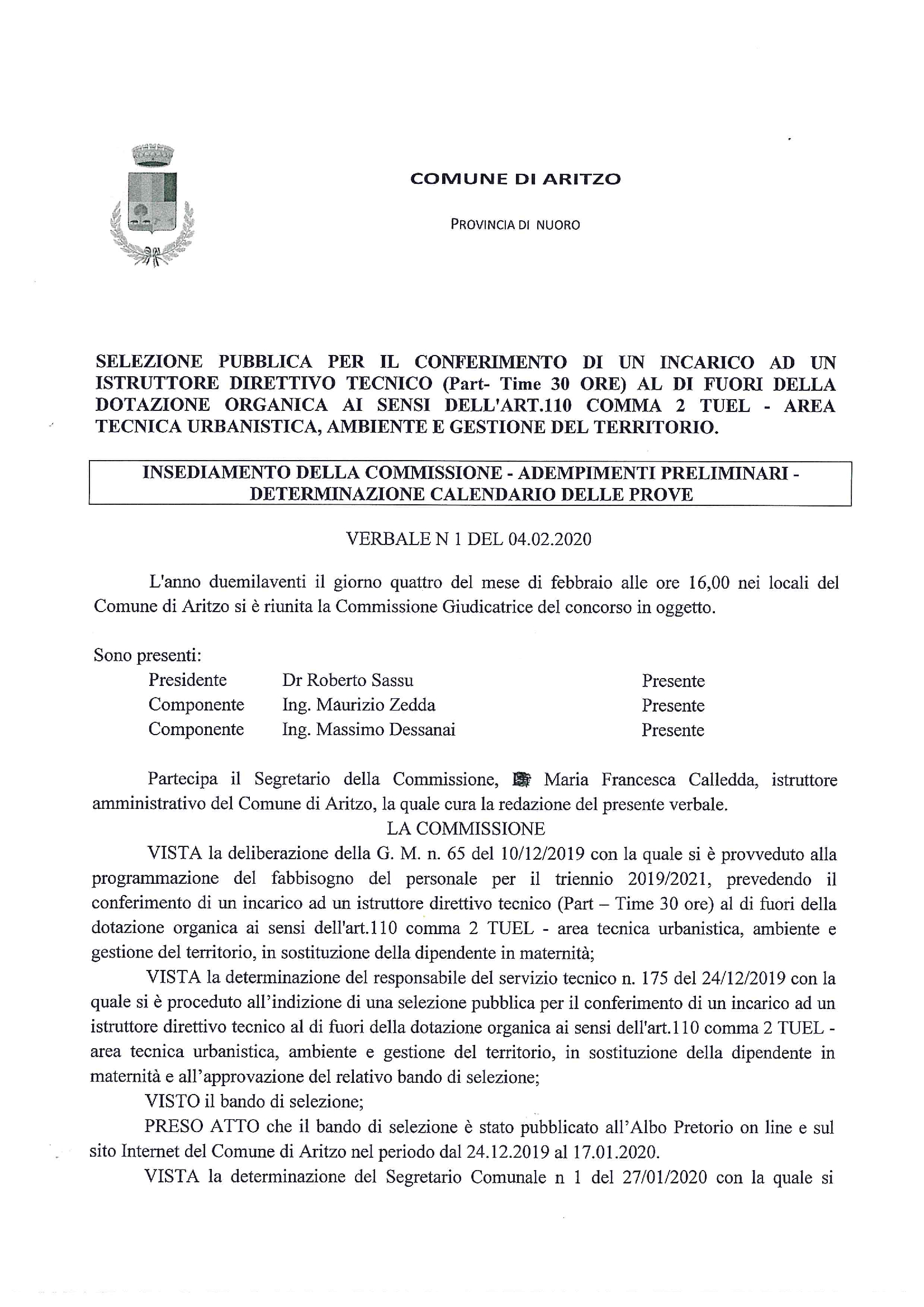 VERBALE N. 1 DEL 4 FEBBRAIO 2020 - SELEZIONE PUBBLICA PER LA COPERTURA DI N. 1 POSTO DI ISTRUTTORE DIRETTIVO A TEMPO DETERMINATO